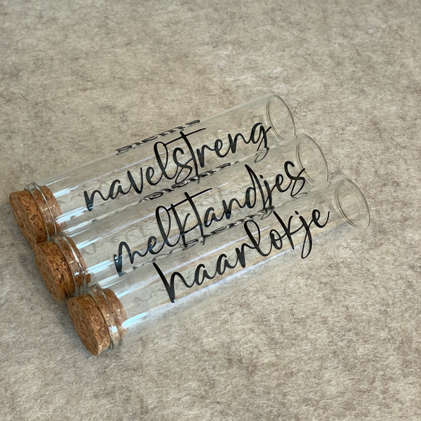 Deze set bestaat uit drie glazen buisjes met een kurkje. Je kunt er het eerste plukje haar, de navelstreng en de melktandjes van je baby in bewaren. Elk buisje wordt gepersonaliseerd met de naam van je kindje, wat het extra speciaal maakt.