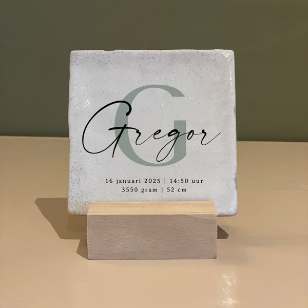 Stuur me de geboortegegevens (naam, datum, gewicht, lengte) en ik maak een ontwerp op maat. Je ontvangt een voorbeeld ter goedkeuring voordat het tegeltje wordt gemaakt, zodat je zeker weet dat het precies is zoals jij het voor ogen hebt.
