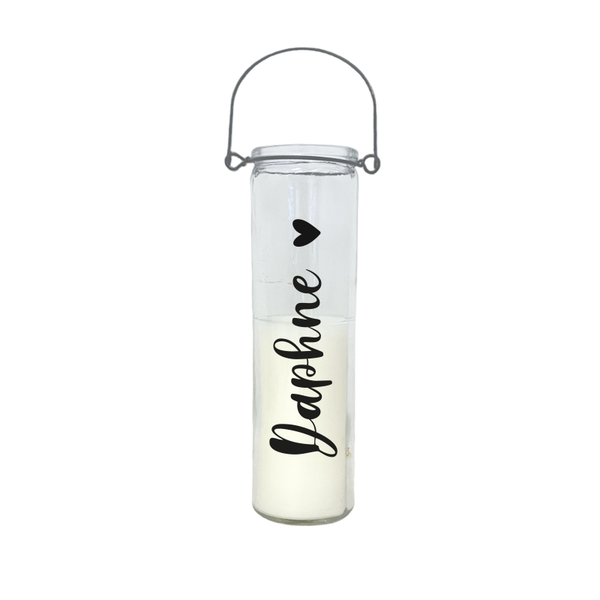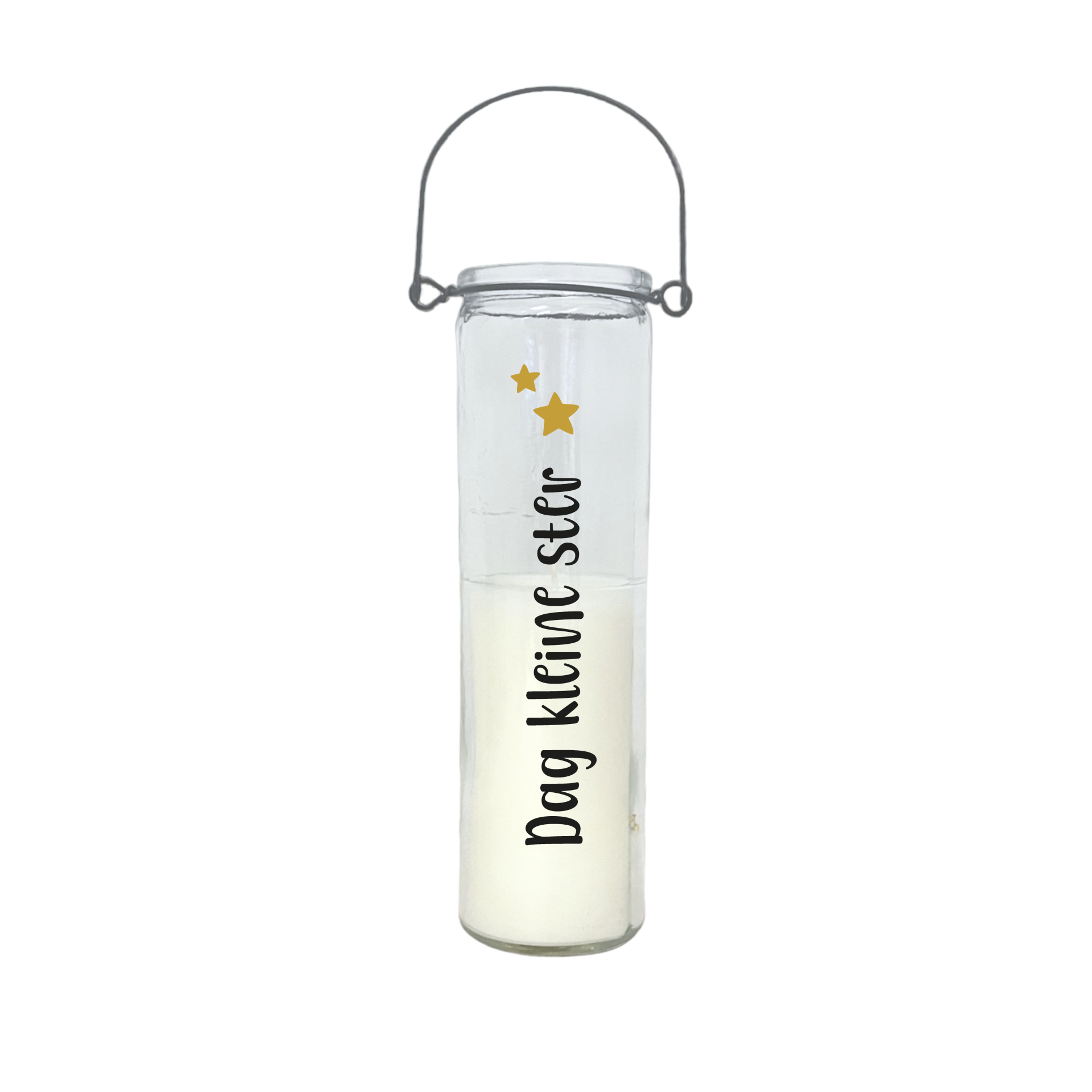 Dit glazen windlicht heeft een metalen hengsel en bevat een witte kaars. Door de hoogte van het glas is het ook geschikt als windlicht voor buiten, bijvoorbeeld bij een gedenkplek of graf.