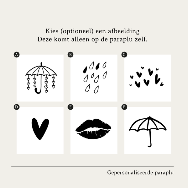Je kunt er ook een afbeelding bij kiezen. Deze wordt samen met de tekst op de paraplu gedrukt (niet op het hoesje). Een afbeelding kiezen is niet verplicht.